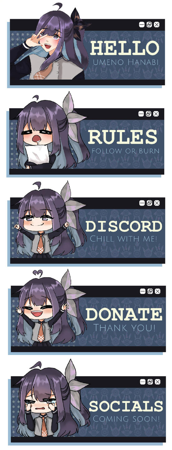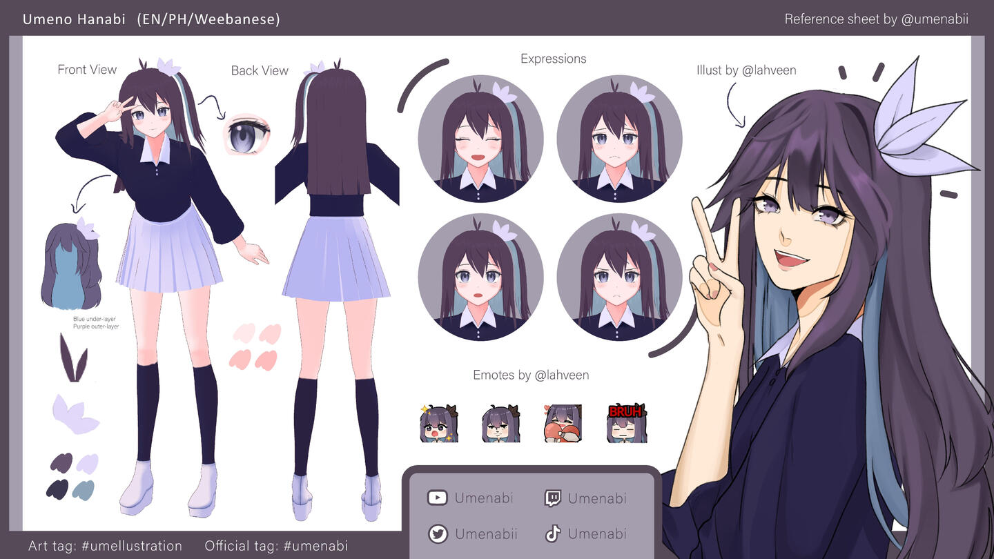 Hi there! I'm Umeno Hanabi (梅の花火), also known as Umenabi (梅ナビ). I'm a VTuber from the Philippines and I enjoy making VTuber-based visual designs for fun and commissions!Please call me Ume or Hanabi, I am fine with both!I post content on Youtube and Tiktok, as well as a Twitch Affiliate on hiatus. Please check out my socials below, your support means the world! :]VTuber Lore: Unknown (No official design yet)✦✦✦